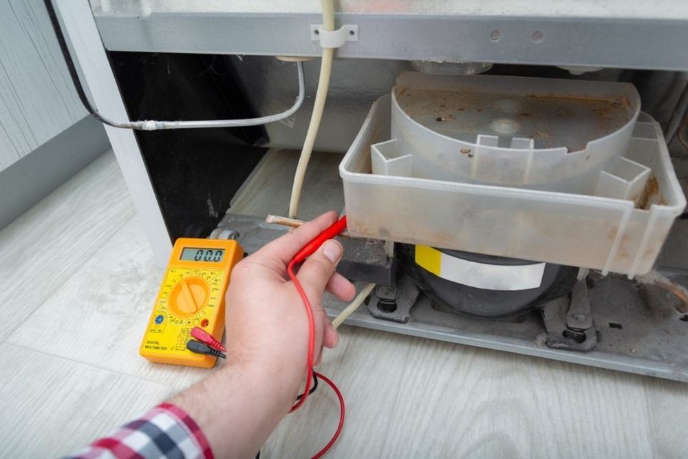 Специалисты снимают с мотор-компрессора кожух, извлекают узел и отсоединяют от него реле. Затем проверяют мультиметром сопротивление между верхним и правым контактом (в норме должно быть 15 Ом), между левым и верхним (норма 20 Ом), между правым и левым (нормальный показатель 30 Ом). Если есть отклонения от предусмотренных параметров, компрессор считается дефектным. Проблема решается преимущественно заменой узла новым.