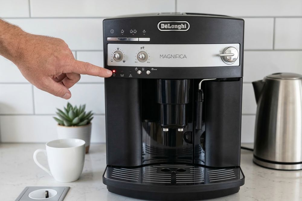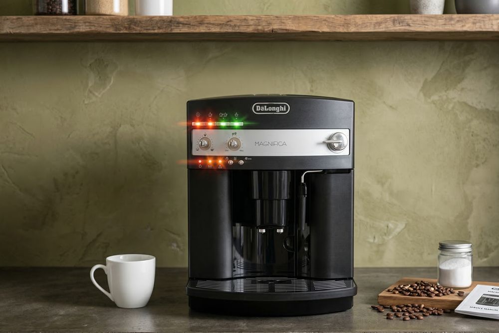 Если после перезагрузки индикатор накипи продолжает гореть, можно попробовать сброс настроек. У большинства моделей DeLonghi откат делается через меню или зажатием определенной комбинации кнопок при включении, точная последовательность есть в инструкции к конкретному аппарату. Сброс переводит машину в исходное состояние, без затрагивания пользовательских настроек помола и крепости кофе.