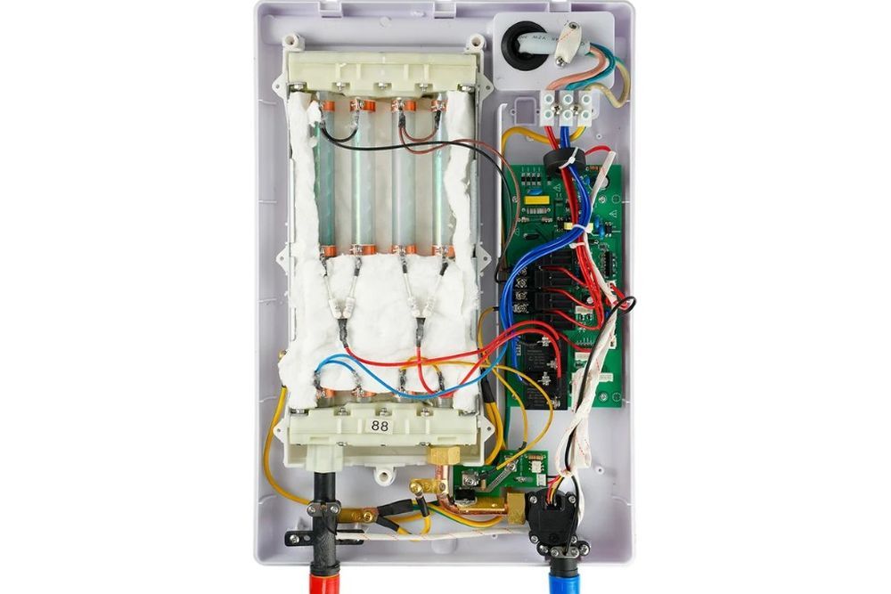 Внутри водонагревателя расположена небольшая цилиндрическая емкость, подключенная с одной стороны к водопроводу, а с другой — к изливу. В этой емкости находится ТЭН (трубчатый электронагреватель), протекая через который вода нагревается. Цепь подключения ТЭНа включает кнопку, датчик давления и термопредохранитель, подключенные последовательно.