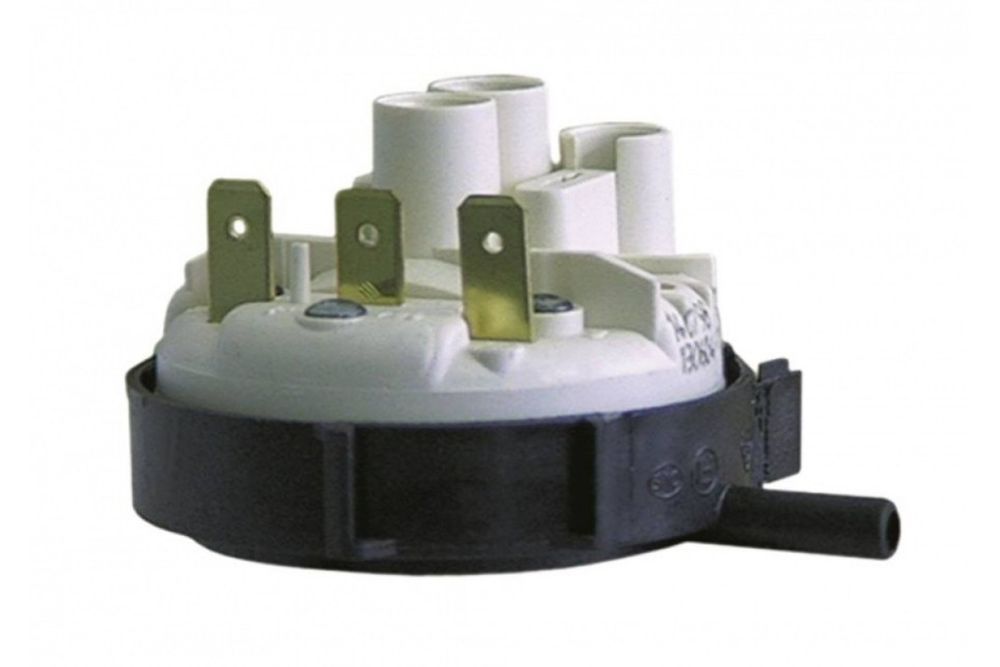 - Найдите прессостат. Обычно он установлен внизу возле сливной помпы. Это маленькая круглая коробочка, к которой присоединены три клеммы и трубка сбоку.