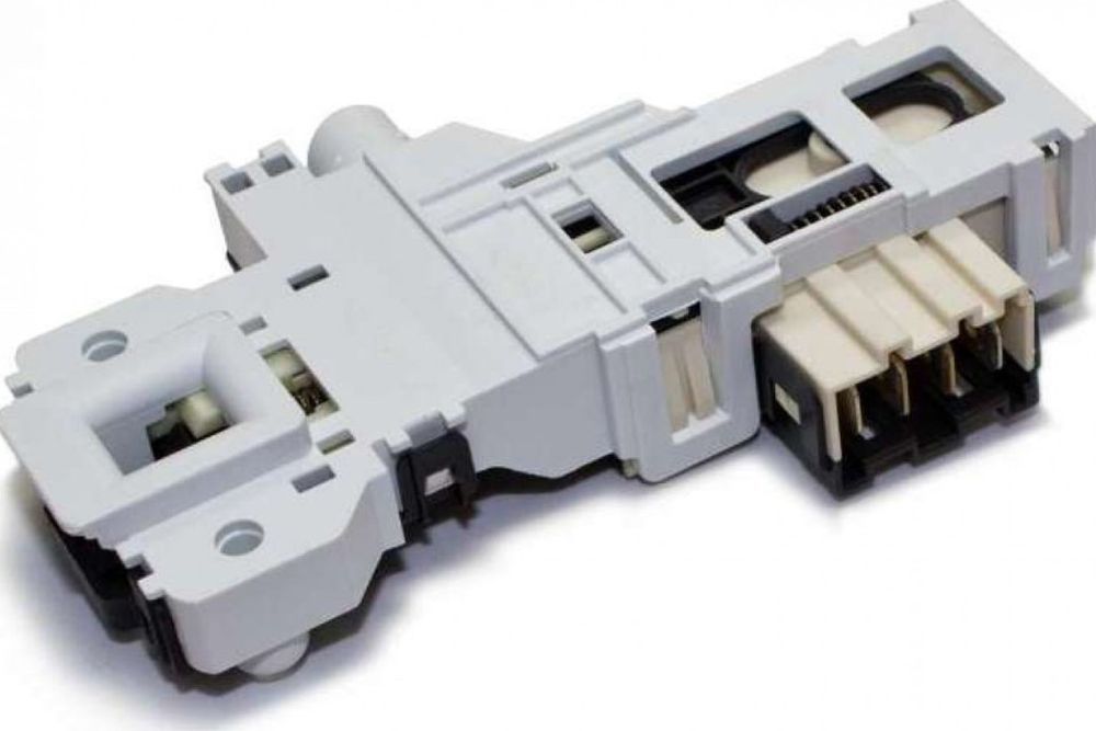 Устройство блокировки люка (УБЛ) — это электромеханический замок, который фиксирует дверцу на протяжении всего цикла стирки. Он состоит из термоэлемента и защелки. При запуске программы на замок подается напряжение, термоэлемент нагревается в течение 1-2 секунд и расширяется, приводя в действие защелку, которая фиксирует дверь.
