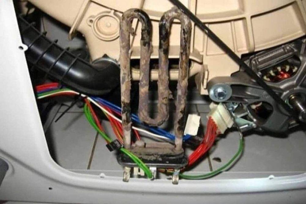 Нагреватель иногда замыкает на корпус. В этом случае модуль управления фиксирует ошибку и блокирует переход к следующему этапу. Для диагностики ТЭНа понадобится мультиметр. Следует снять заднюю панель, найти ТЭН внизу бака и проверить его сопротивление. Между контактами должно быть 20-40 Ом, а при проверке на корпус мультиметр показывает обрыв. Когда прибор показывает замыкание на корпус, ТЭН поврежден и требует замены.