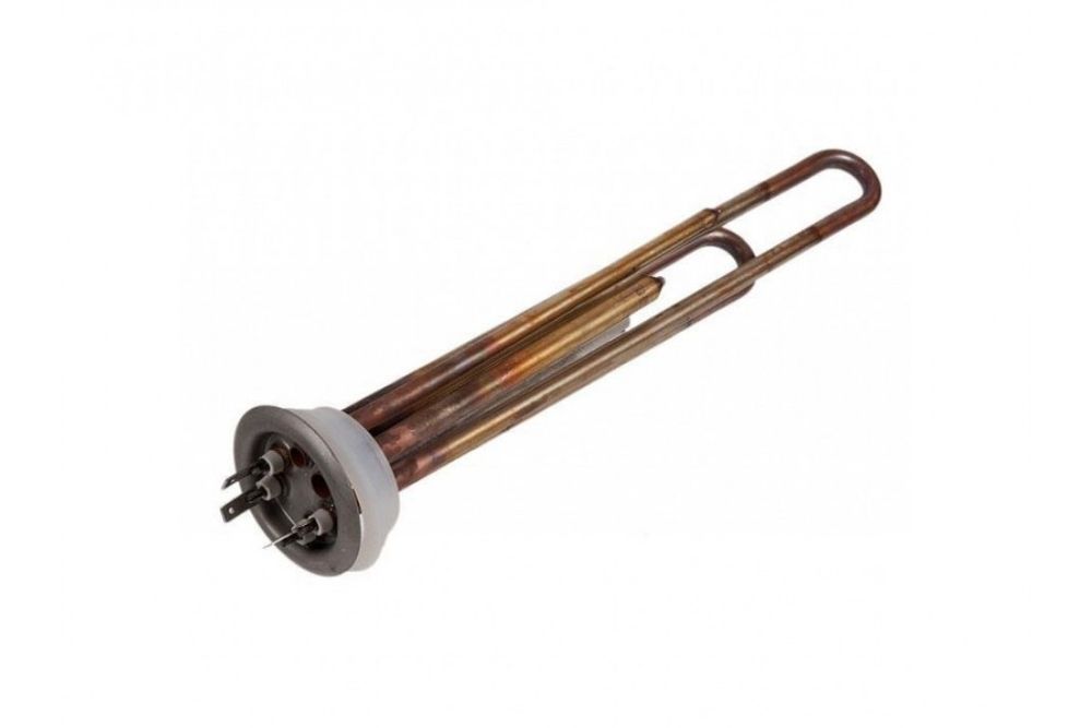 - Извлеките из бака ТЭН, установленный на фланце. Чтобы его извлечь, просто потяните фланец вниз. При этом учитывайте, что из-за накипи извлечь ТЭН из бака может оказаться непросто, так как накипевший слой будет мешать. При необходимости пошевелите ТЭН вниз, вверх и в стороны.